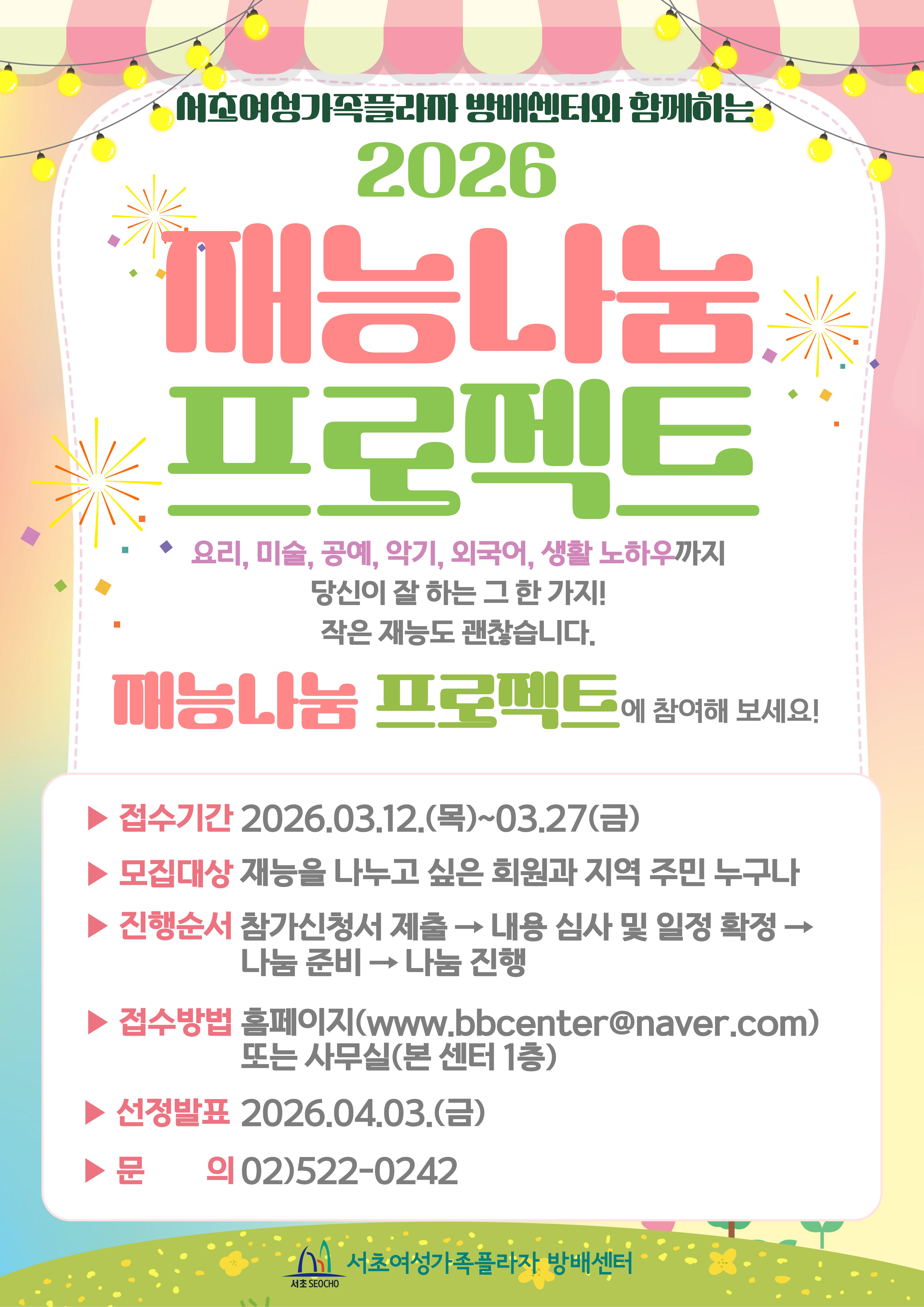 재능나눔 프로젝트를 통해 다양한 분야에서 갈고 닦은 재능과 숨은 끼를 지역주민과 나누고 싶은 분들의 많은 관심과 참여 바랍니다.